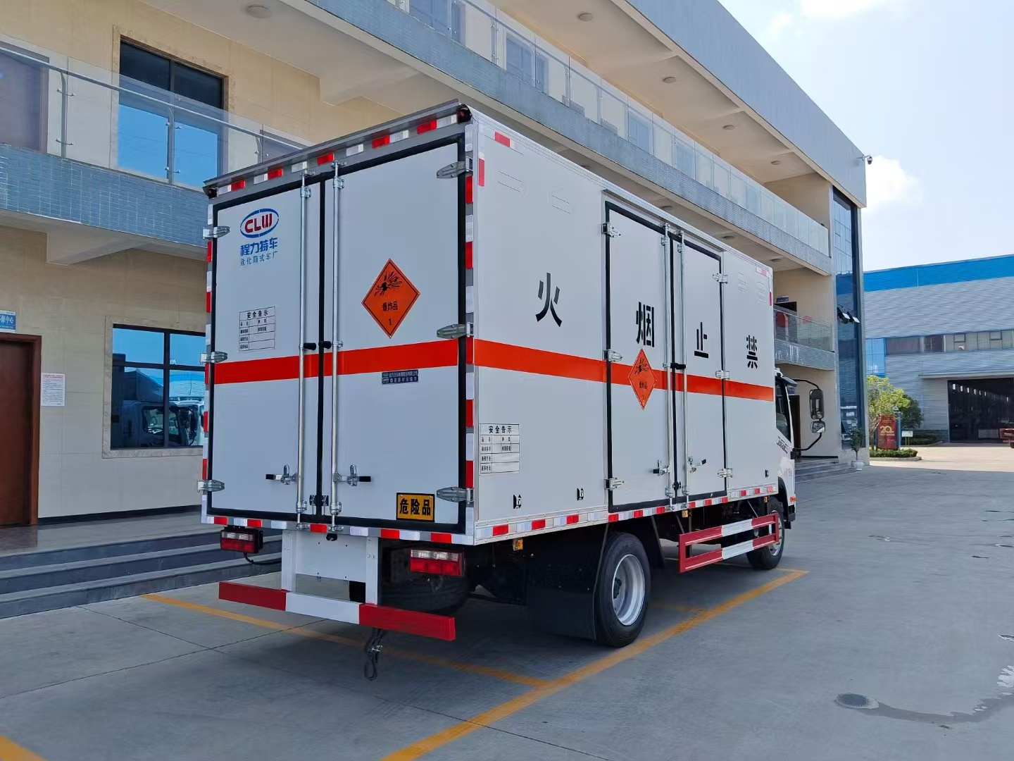 | 貨箱配置 | 廂體為雙層金屬骨架結構,外板采用冷軋鋼板,中間填充阻燃泡沫,內飾為鋁板。底板為平板上鋪防靜電膠皮。廂內兩側加裝固定貨物臥環,門框帶防盜報警器,頂部帶煙霧報警器,廂體右側選裝側門,隨車配2個滅火器,危險標志牌,防火帽,危險品三角頂燈。 (尾部可選裝液壓升降尾板) | ||