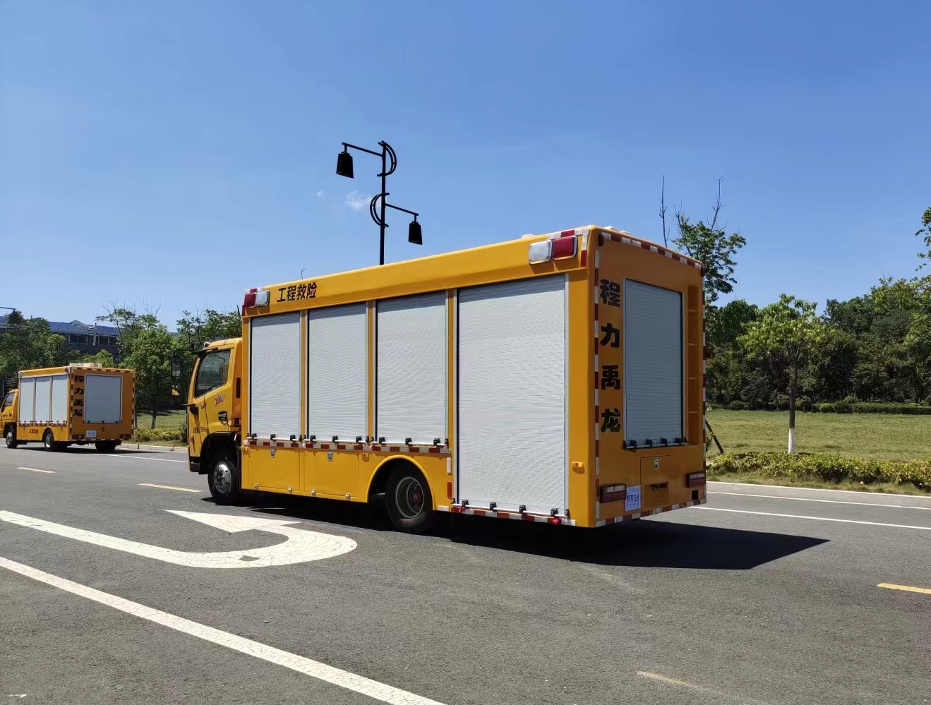 | 上裝配置 | 1、廂體外形尺寸根據(jù)實(shí)際公告標(biāo)準(zhǔn)。 廂體:具備運(yùn)輸、防雨、防火、阻燃、防塵、防銹、降燥,隔震、長期抗震結(jié)構(gòu)。外部鋼材為優(yōu)質(zhì)冷軋鋼板,表面處理平整,內(nèi)襯優(yōu)質(zhì)冷軋鋼板折彎骨架,強(qiáng)度牢固,配重合理。 2、廂體一體化鋼體結(jié)構(gòu)設(shè)計(jì), 頂部平坦。廂體采用骨架式夾層形式,外蒙皮采用厚1.5mm優(yōu)質(zhì)防銹處理的汽車專用冷軋鋼板,中間骨架采用防銹處理后的鋼管焊接,頂層、側(cè)圍內(nèi)、外層之間填充長時間使用對人體無害的防火阻燃環(huán)保吸音棉,外層鋪蓋一層阻燃金屬布,內(nèi)飾采用0.8mm厚網(wǎng)孔板。底板采用鋼結(jié)構(gòu)底框架,上表面鋪厚2mm花紋鋼板。 3、車輛廂體采用整體包覆式,廂體兩側(cè)下部設(shè)置裙邊式,全封閉式結(jié)構(gòu),頂部為圓弧型,尾部有轉(zhuǎn)向燈、剎車燈、尾燈、霧燈,箱體表面光滑平整。車廂靠駕駛室前部為休息室,休息室內(nèi)帶折疊坐椅及折疊桌,往后為機(jī)組室,機(jī)組室左、右側(cè)布置進(jìn)排風(fēng)百窗,設(shè)置機(jī)組檢修門一個,下置登車踏步梯,車廂后端為后為卷簾門。右側(cè)排風(fēng)百葉窗下部為維修觀察艙門。左側(cè)下圍設(shè)置有工具箱及功能艙門等。右側(cè)下圍設(shè)置有汽車油箱艙、液壓控制艙等。 4、車廂尾部配置標(biāo)準(zhǔn)儲物貨架讓出水帶、加長電纜等附件存放有序、互不干涉,讓緊急排水搶險(xiǎn)變得更加快捷、有效。 5、廂體噴漆:工程黃,與車頭同一顏色; 6、最終的門數(shù),形式,打開方式嚴(yán)格按照合同要求依據(jù)程力公告生產(chǎn); | ||
